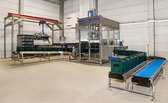 Gerade weil das Thema Problemlösung und Dienstleistung bei Pretsch von Lerchenhorst auf der Agenda ganz oben steht, fiel die Entscheidung in eine Anlage zu investieren, die das Einpacken von Neu- und Gebrauchtflaschen in Kästen übernimmt und die ein Umpacken von in Kästen befindlichen befüllten Flaschen in Kartonagen realisiert. Die neue Maschine verarbeitet 0,5-l-Euroflaschen, 0,5-l-NRW-Flaschen, 0,5-l- sowie 0,33-l-Aleflaschen, 0,33-l-Vichyflaschen und 0,33-l-Gourmetflaschen sowie die entsprechenden 20er- und 24-er-Kästen nebst 20-er und 24-er-Kartonverpackungen.